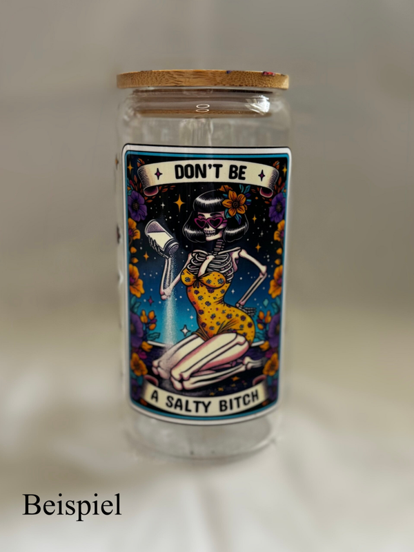 Unser Glasbecher enthält einen nachhaltigen Bambusdeckel & Strohhalm. Handveredelt und personalisierbar.